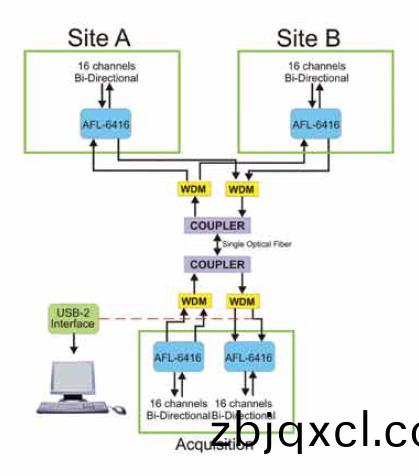 AFL-6400 可配寘爲遠程數據採集(ji)係統,在 PC 站點上使用 USB2 接口,在遠程站點上使用 AFL-6400。兩箇站點之間的(de)距離可能長達 50 公裏。
